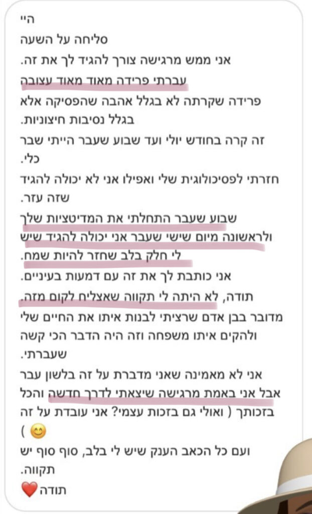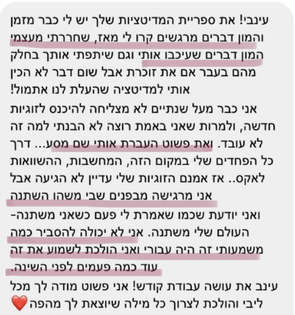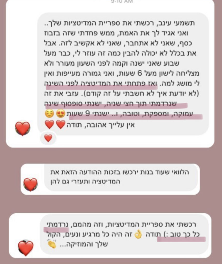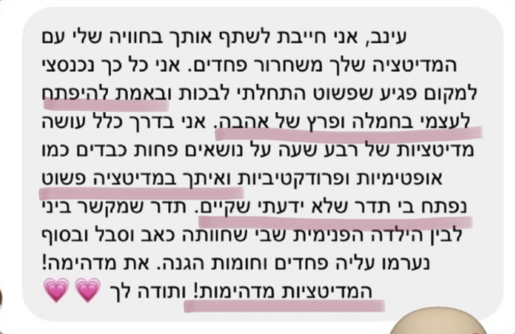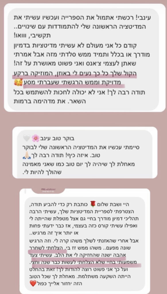 "אני מרגישה את ההשפעה של המדיטציות בחיים שלי בכל דבר. כשעינב מדברת זה ממש כאילו שהיא מדברת אליי, ואחרי שאני מקשיבה לזה, אני ממש מרגישה שאני יכולה להתמודד עם הכל."