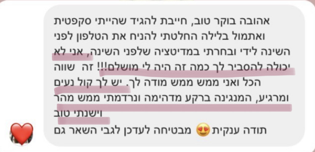 תראי, יש נשים שמאזינות להקלטות שלי גם בזמנים נקודתיים בחייהן; בזמן לחץ, לפני סיטואציה חשובה ומשמעותית, כשקיים קושי להירדם וכו’.