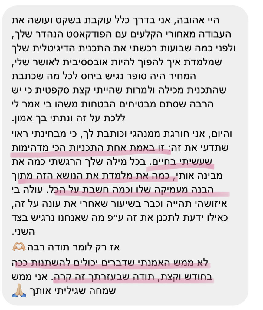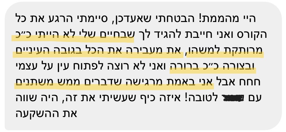 ככה שגם אם היית בתכנית אחרת שלי, את יכולה לדעת שהרבה מאוד דברים הולכים להתחדש לך כאן בצורה מהותית, ושאת מגיעה למסע משמעותי, עמוק ומרגש במיוחד.