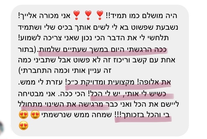 איך? כיוון שהעבודה היא תמיד עלייך ועל מה שבשליטתך [ולא עליו…] וככה, כשאת עובדת יחד איתי בדיוק על זה, את מכינה את עצמך בצורה המיטבית ליחסים זוגיים עתידיים ומגדילה משמעותית את הסיכוי למשוך אדם שמתאים לתדר החדש שיצרת לך ולהפסיק לשחזר את העבר.