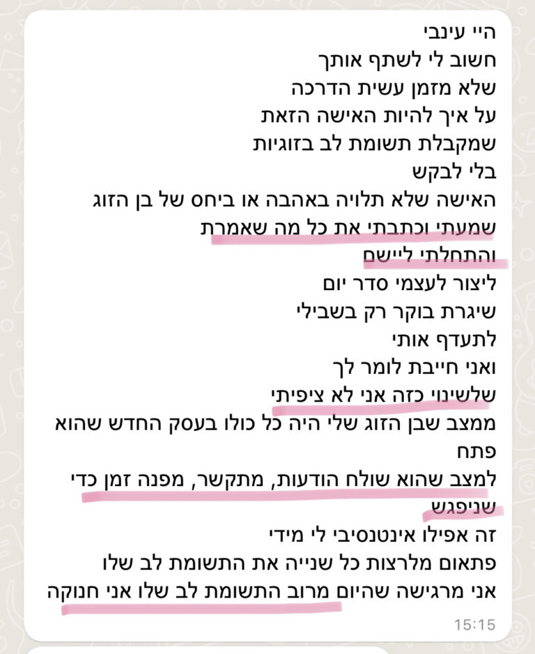 אני באמת רוצה שתצליחי, ושאם את זקוקה לעזרה וחיזוק של הביטחון העצמי שלך בזוגיות שלך,